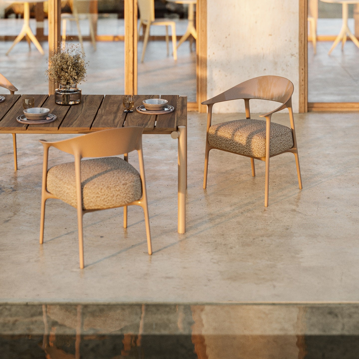 The chairs’ solid wood frame is carefully crafted in the same finish as the TV cabinet, reinforcing a sense of continuity throughout the space. This uniform design approach creates a balanced and elegant atmosphere while maintaining durability and comfort.