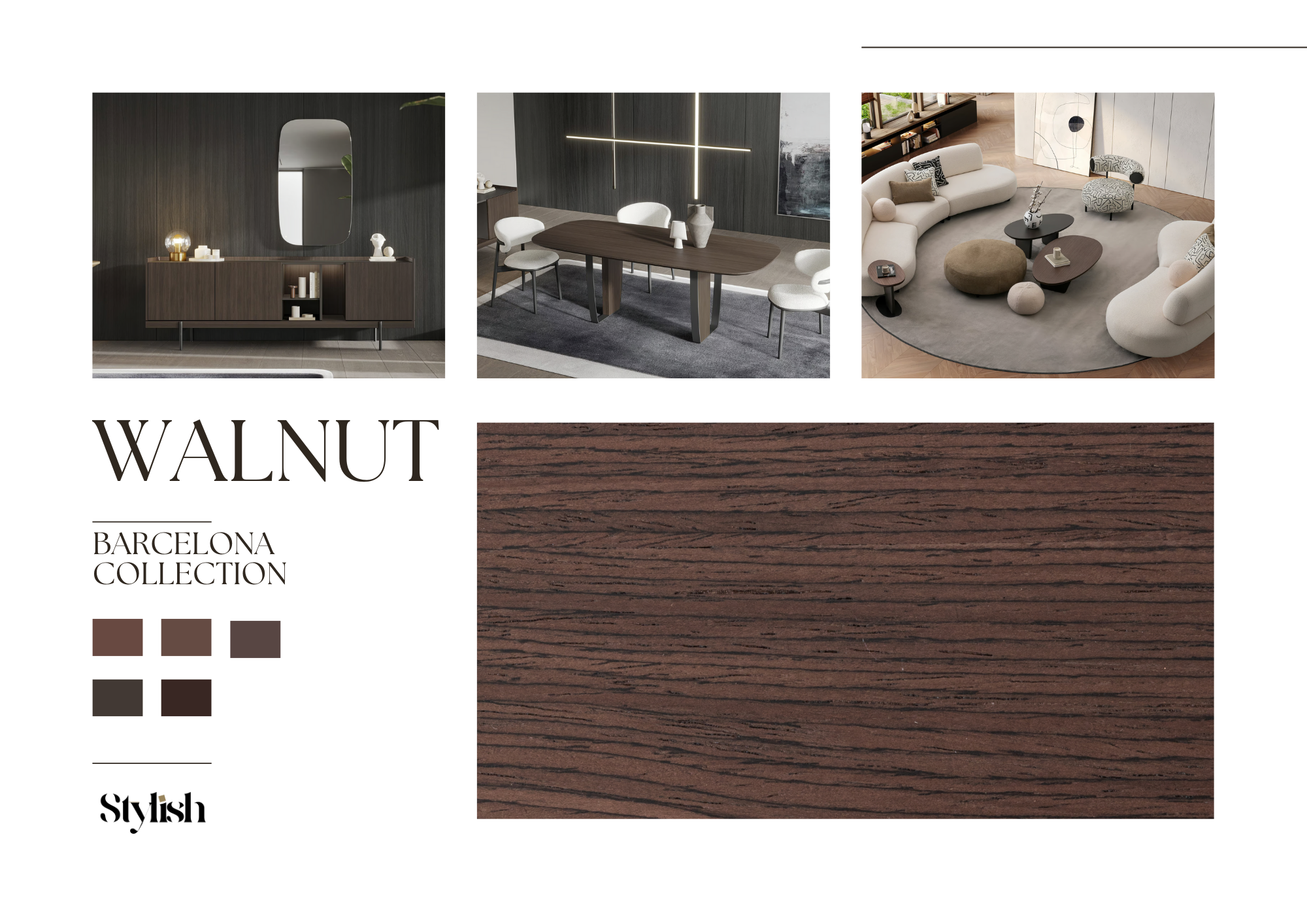 Every piece in the Barcelona Collection—from the sideboard and dining table to the TV unit, chairs, and coffee tables—is made from the same high-quality walnut. This ensures a consistent color, texture, and luxurious feel, creating a perfectly harmonized space.